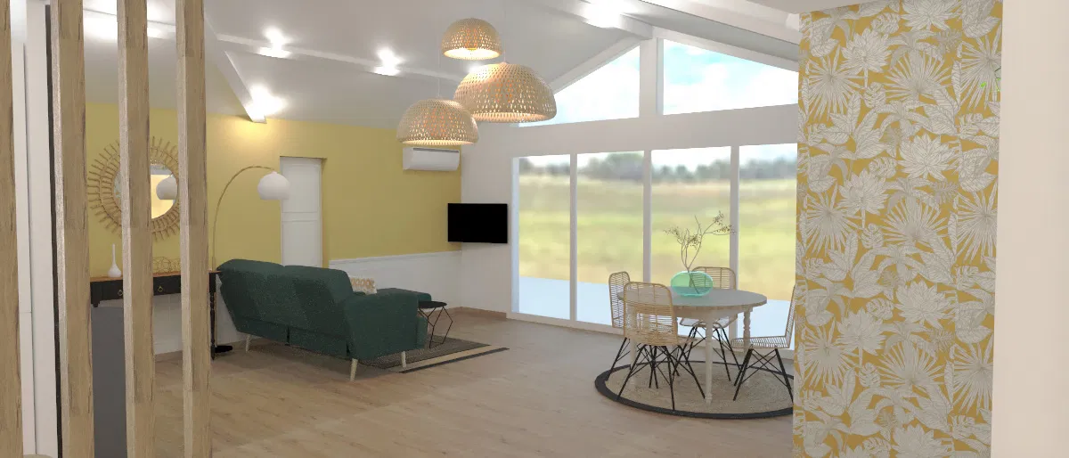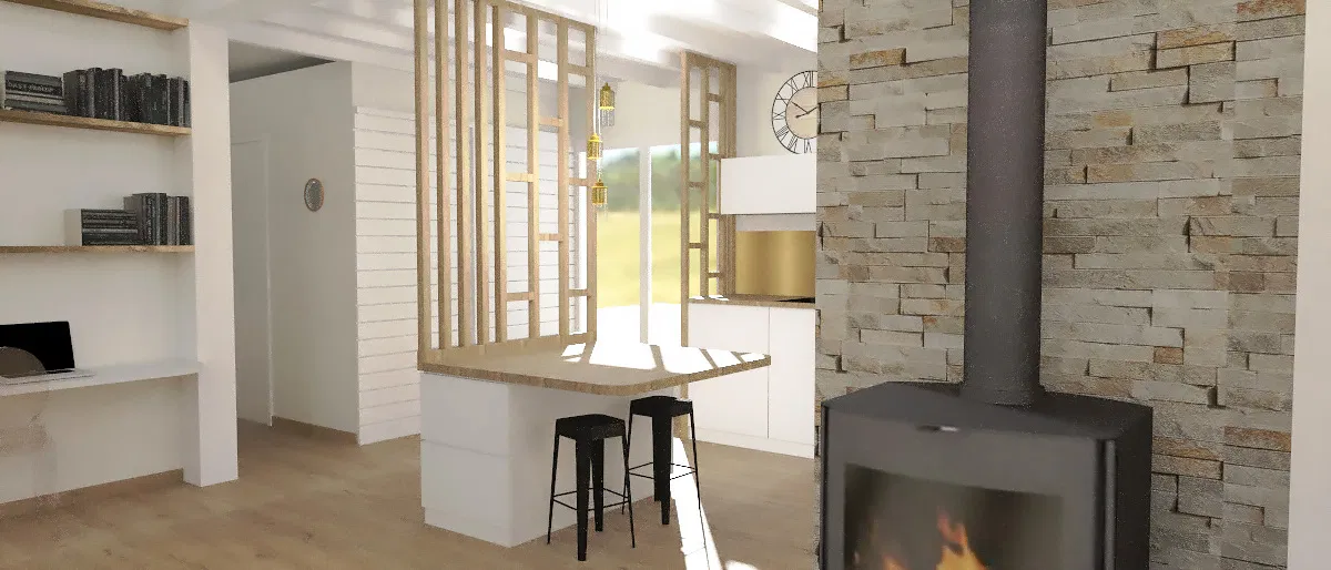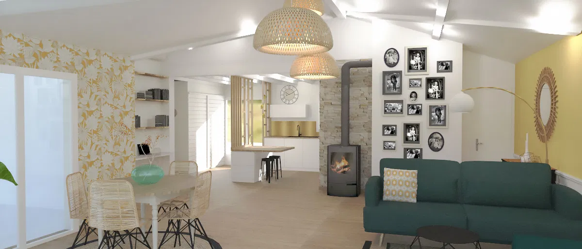 aménagement et décoration intérieure de l'espace cuisine, salon, et salle à manger